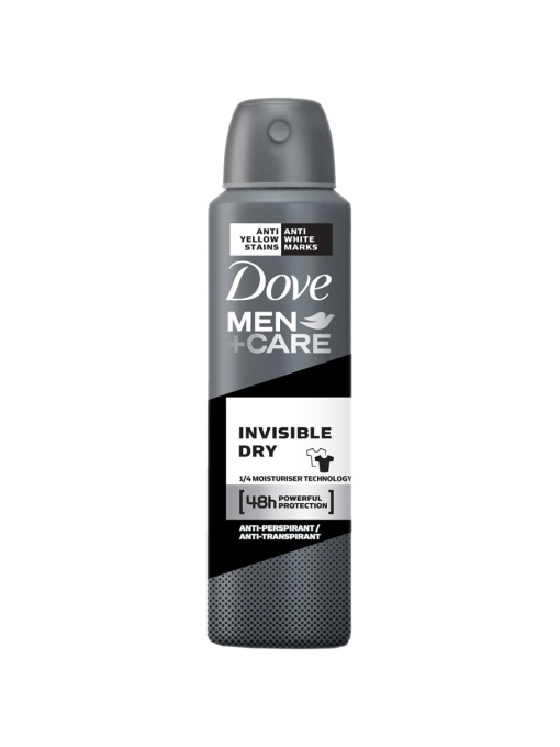 Dove Men+Care Invisible Fresh 48h este un antiperspirant spray creat pentru bărbații activi, care își doresc protecție eficientă fără urme pe haine. Formula sa oferă până la 48 de ore de protecție împotriva transpirației și mirosurilor neplăcute, menținând pielea uscată, confortabilă și protejată. Totodată, nu lasă pete albe pe hainele închise și nici pete galbene pe hainele deschise.