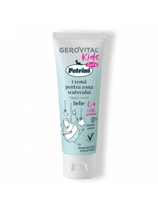 Gerovital Kids Petrini Forte Cremă pentru Zona Scutecului este un produs-dermatocosmetic de îngrijire a pielii în caz de eritem fesier. Sunt stimulate procesele de regenerare și cicatrizare a pielii, datorită D-Pantenolului și Uleiului de gălbenele. Calmează pielea iritată și reduce roșeața și disconfortul. Produs testat dermatologic, prietenos cu pielea, care nu conține coloranți sau parfum.