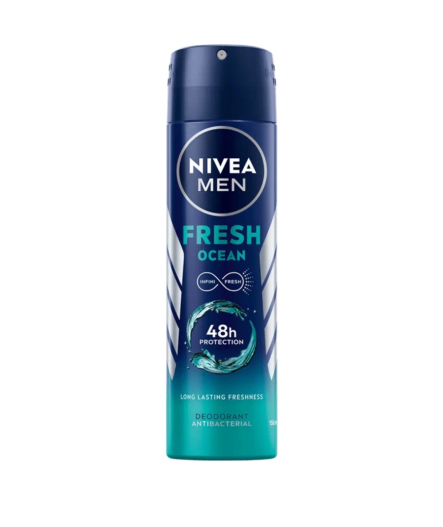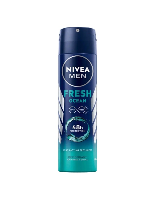 Nivea Men Fresh Ocean este un antiperspirant spray cu parfum masculin, proaspăt și revigorant, inspirat din notele marine. Oferă protecție eficientă împotriva transpirației și mirosurilor pentru până la 48 de ore, menținând pielea uscată și plăcut parfumată.