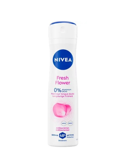 Nivea Fresh Flower este un antiperspirant spray feminin cu un parfum floral fresh, ușor și energizant. Formula oferă protecție de până la 48 de ore împotriva transpirației și a mirosurilor neplăcute, menținând pielea uscată și confortabilă pe tot parcursul zilei.