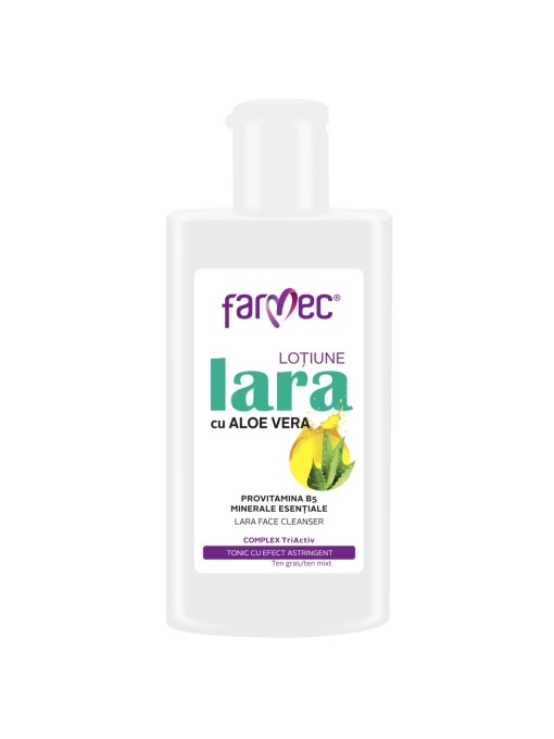 Loțiunea de curățare Lara cu Aloe Vera, Provitamina B5 și minerale esențiale este formulată pentru a curăța eficient și delicat tenul, în timp ce ajută la menținerea hidratării și confortului pielii. Combinația de ingrediente active contribuie la calmarea, revitalizarea și protejarea pielii împotriva factorilor externi, lăsând tenul proaspăt și catifelat după fiecare utilizare.