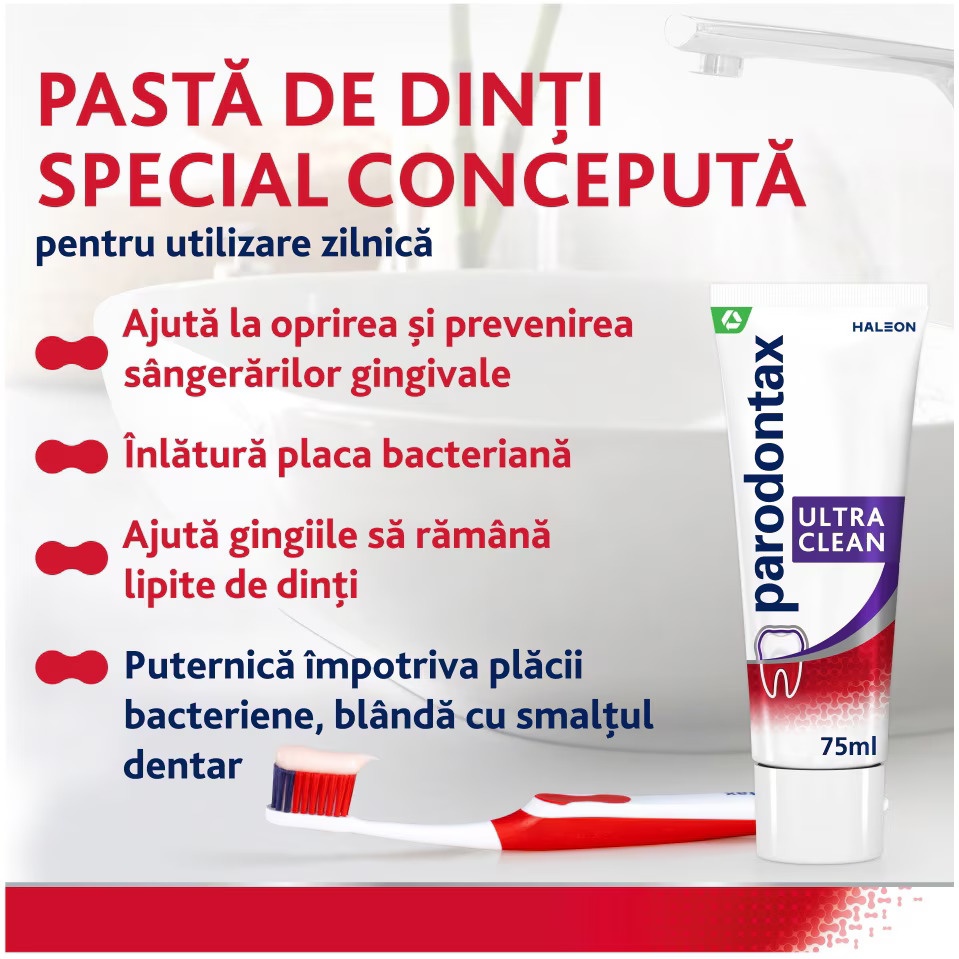 Pasta de dinți Parodontax Ultra Clean este creată special pentru persoanele care se confruntă cu sângerări gingivale sau sensibilitate gingivală. Formula sa cu bicarbonat de sodiu ajută la îndepărtarea plăcii bacteriene, menține gingiile sănătoase și oferă o respirație proaspătă. Textura caracteristică Parodontax asigură o curățare profundă, iar versiunea Ultra Clean lasă o senzație de prospețime îndelungată după periaj. Setul conține două tuburi a câte 75 ml, ideal pentru utilizare zilnică în familie.